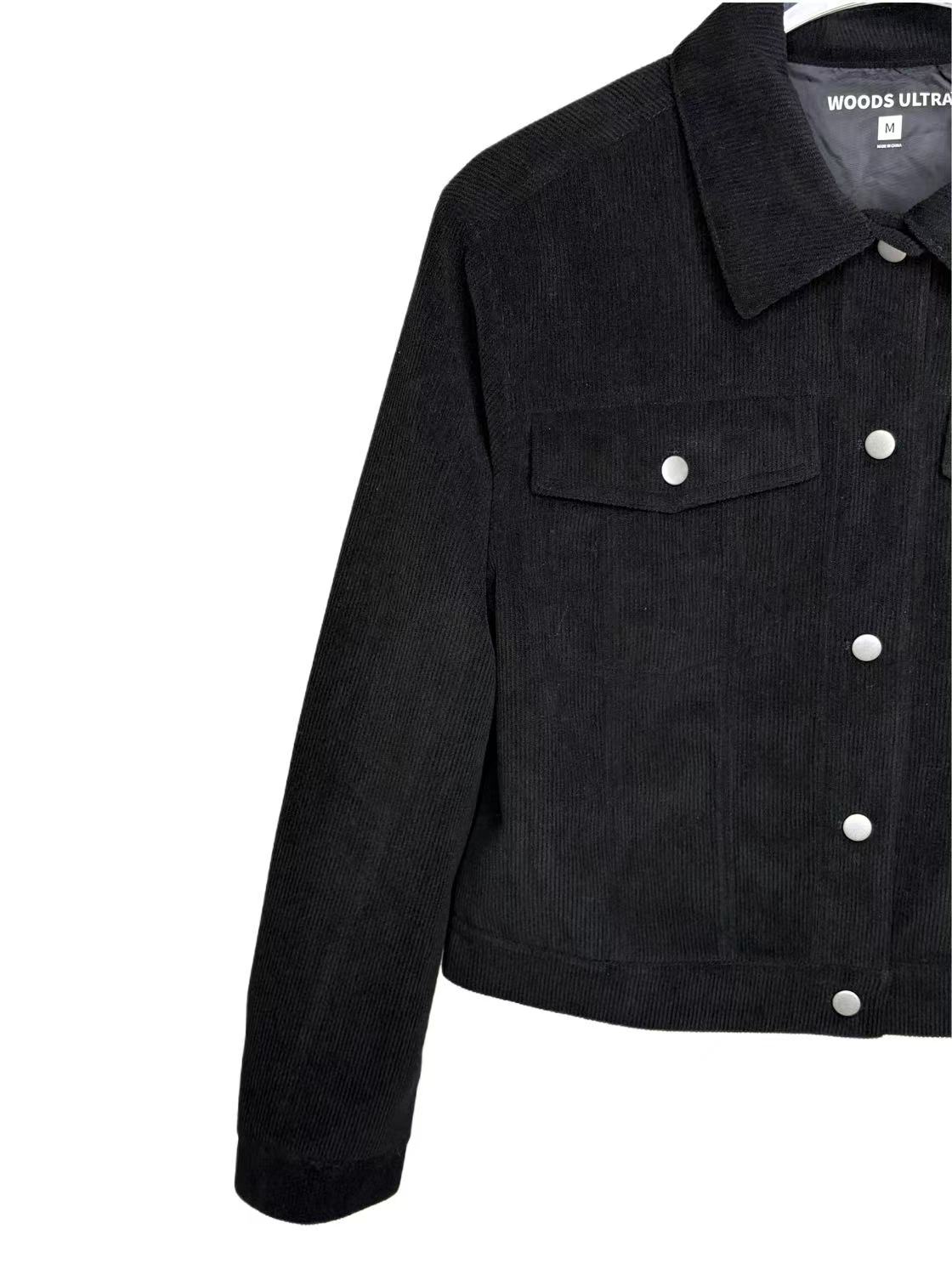 This is a short black corduroy jacket with a retro yet fashionable style.