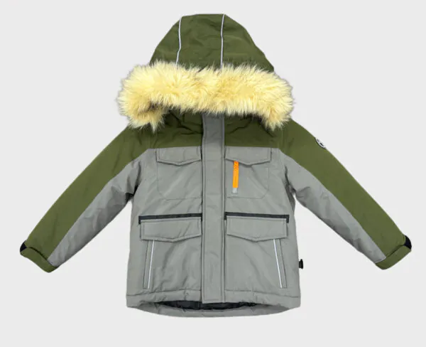 This children’s jacket is both stylish and practical, and is made for cold weather. The main body of the jacket is in a calm grey tone, with green and orange cleverly integrated to add a bit of vitality and dynamism to the overall look. The faux fur collar design is not only environmentally friendly, but also provides excellent warmth, ensuring that children can stay warm and comfortable even in the cold winter.