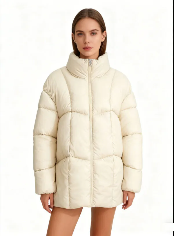 Design: High-neck stand collar + zipper closure; the body features a large-check quilted, fluffy cotton design (visually full and warm); the fit is slightly oversized, and the length reaches approximately to the thigh.