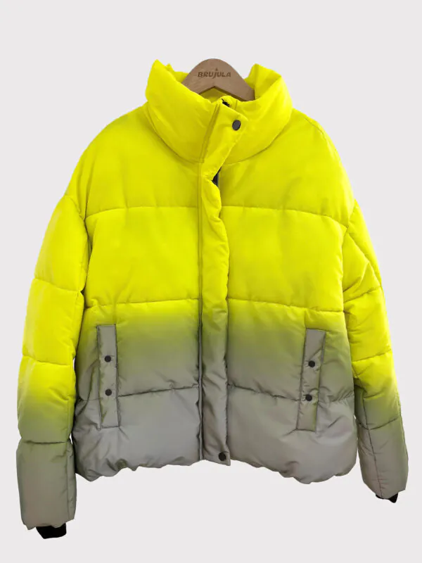 This jacket is a fluorescent yellow and gray gradient jacket with a unique and layered design. The jacket has a high collar design, which can well protect the neck from the cold wind and also add a sense of fashion.