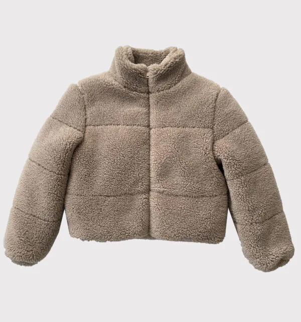 This short teddy bear jacket has an invisible centre front zipper and a stand-up collar.