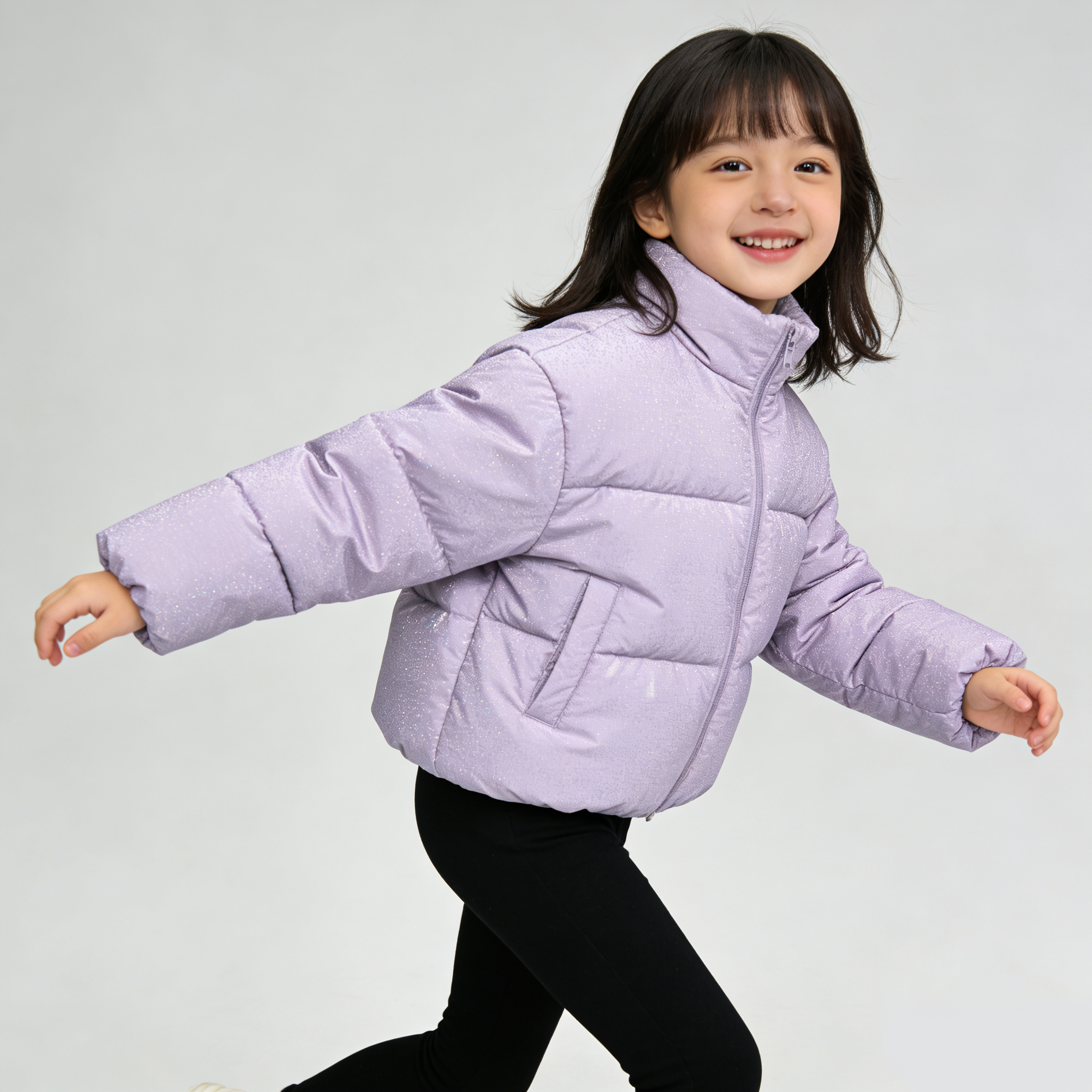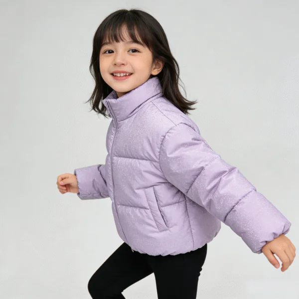 Design Style: The overall design features a puffy, quilted silhouette and a short, cropped cut for a lively and neat look. The stand-up collar and full-length zipper provide both warmth and ease of wear. Simple patch pockets on both sides of the garment add clean and practical details. Fabric Features: Made from mosaic-patterned release paper fabric, this material has a delicate, shimmering texture and a subtle “mosaic” pattern, giving it a refined and sophisticated look. It is also typically lightweight and windproof, making it suitable for children’s winter wear. Suitable Occasions: The soft lavender purple is a popular color in children’s clothing these days, and the glossy fabric adds an eye-catching element. It’s perfect for everyday wear, school, or holiday occasions, offering both warmth and style.