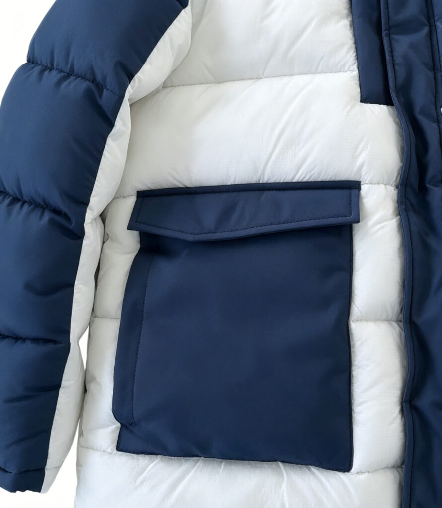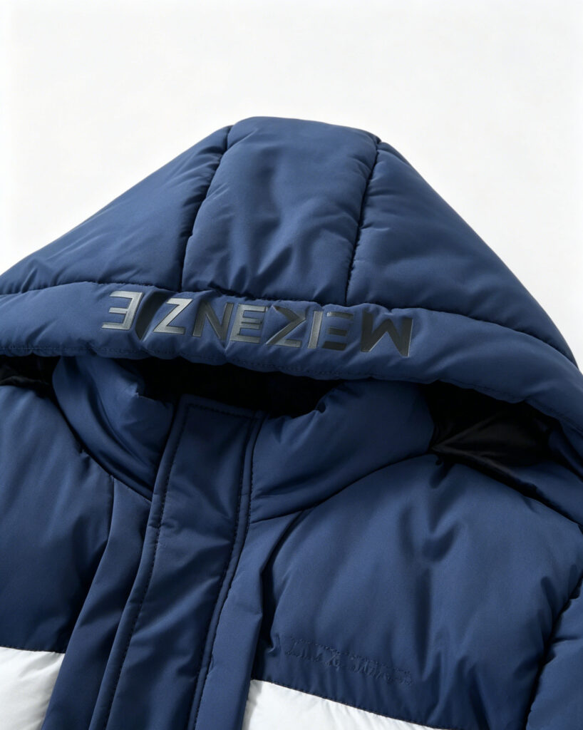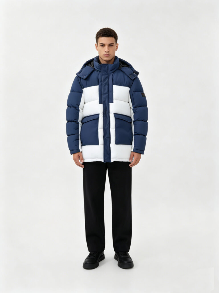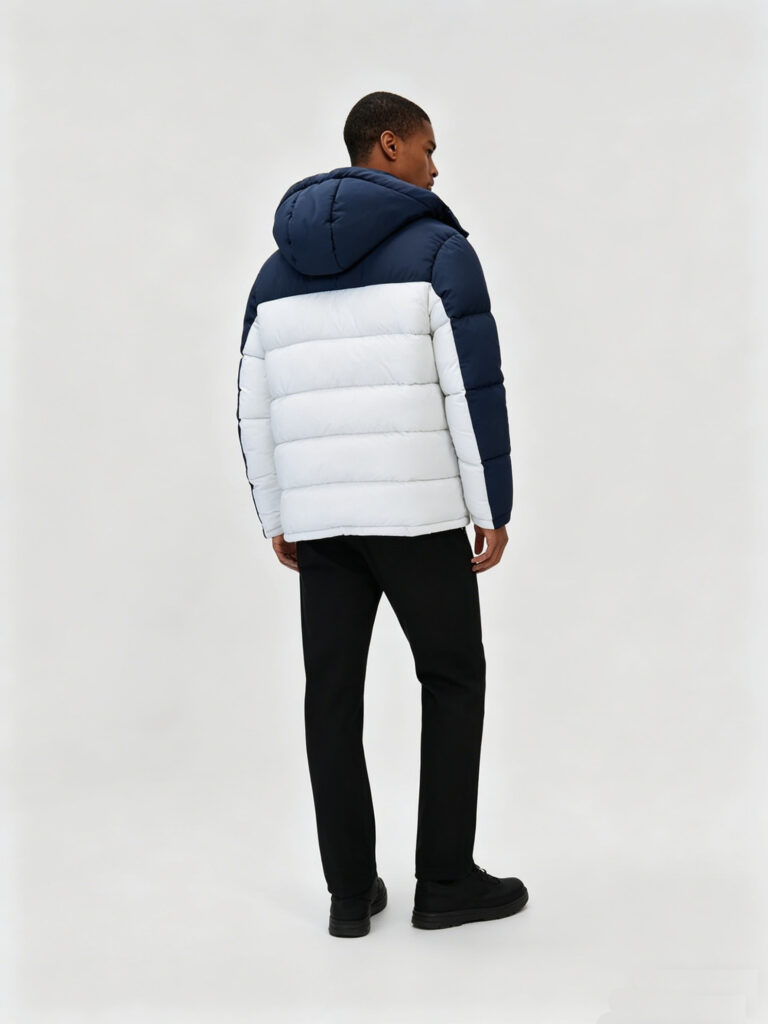 This men’s blue and white color-block hooded padded jacket is a trendy choice that combines style and warmth for autumn and winter. The overall design features classic blue-and-white color blocking, creating a striking visual hierarchy with a minimalist yet stylish aura, easily shaping a neat and fashionable autumn/winter look for men.