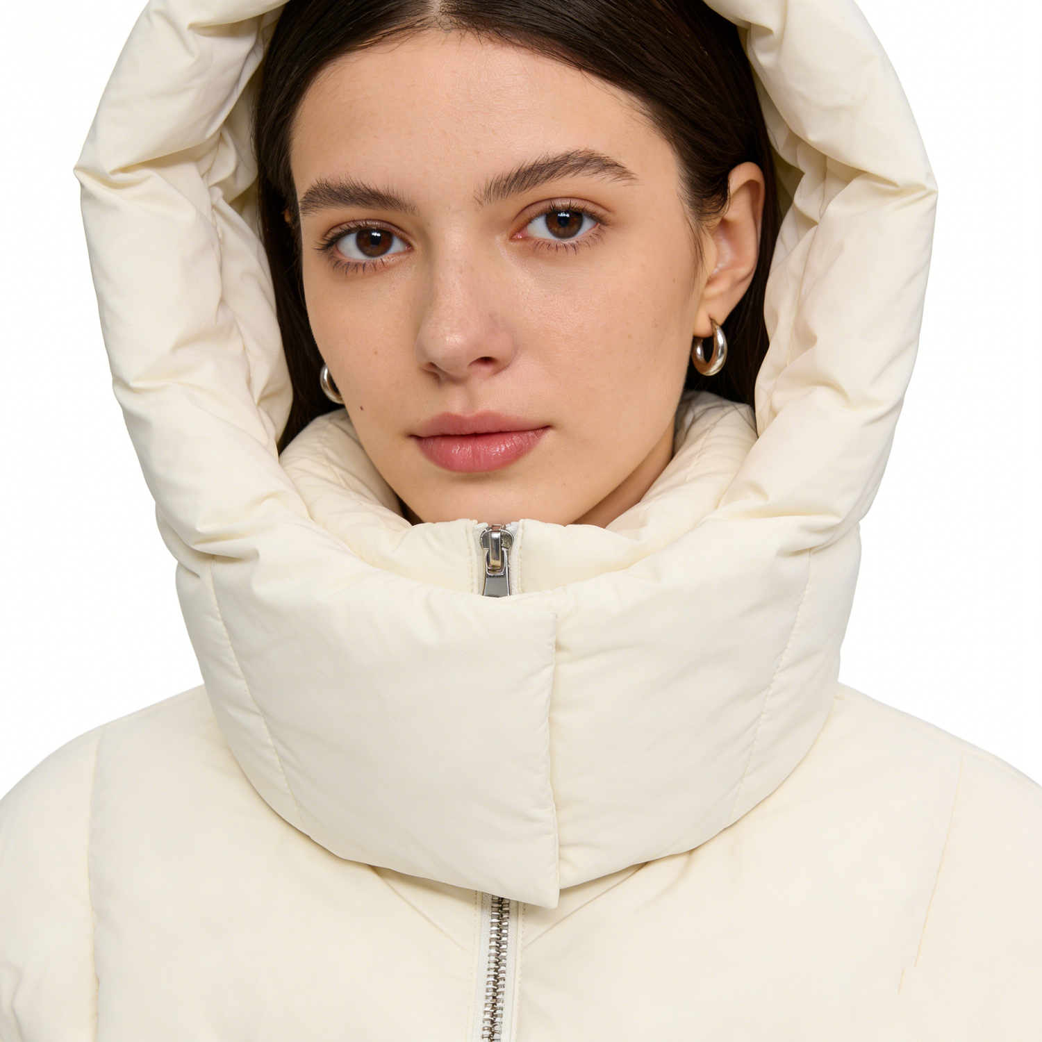 comfort without feeling bulky. The hood integrates seamlessly with the jacket’s high collar, creating a cohesive, wind-resistant