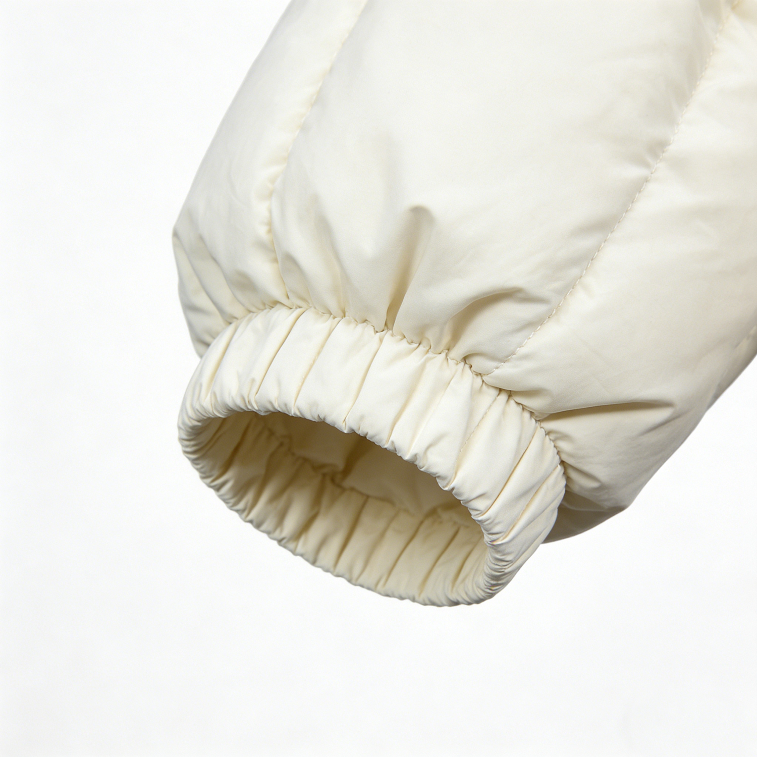 edge is finished with clean, reinforced stitching that aligns with the jacket’s structured quilting lines, preventing fraying and
