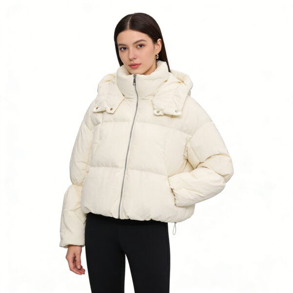 At the hood’s base (where it attaches to the jacket’s collar), two metal snap buttons (in a subtle, matching light-tone finish)