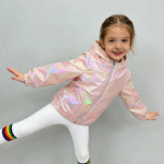 Visual Focus: Made with iridescent laser fabric, it displays a gradient shimmer of pink, purple, gold, and green under the light, like a dazzling “rainbow candy.” This is a very popular “trendy and sweet” style in children’s clothing in recent years, and it’s especially good at capturing children’s attention. Fit and Details: It’s a hooded short jacket, with a hood design that provides wind protection; the front closure uses a simple zipper design for easy wearing and removal; the cuffs and hem are elasticized, which fits the body, prevents wind leakage, and makes the overall silhouette more streamlined; the overall cut is loose and unrestricted, suitable for children’s activities. Suitable Occasions: The lightweight laser fabric is usually windproof and waterproof, suitable for wearing as an outer layer in spring and autumn, or as an inner layer for layering in winter. Whether for everyday outings or holiday parties, the eye-catching shimmer will easily make your child the center of attention.