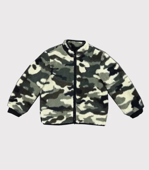 This piece of clothing is a camouflage pattern jacket, with green and black as the main colors, and cleverly integrated with white and gray camouflage elements, making the whole jacket look dynamic and fashionable. The jacket is designed with a full zipper for easy wearing and taking off.