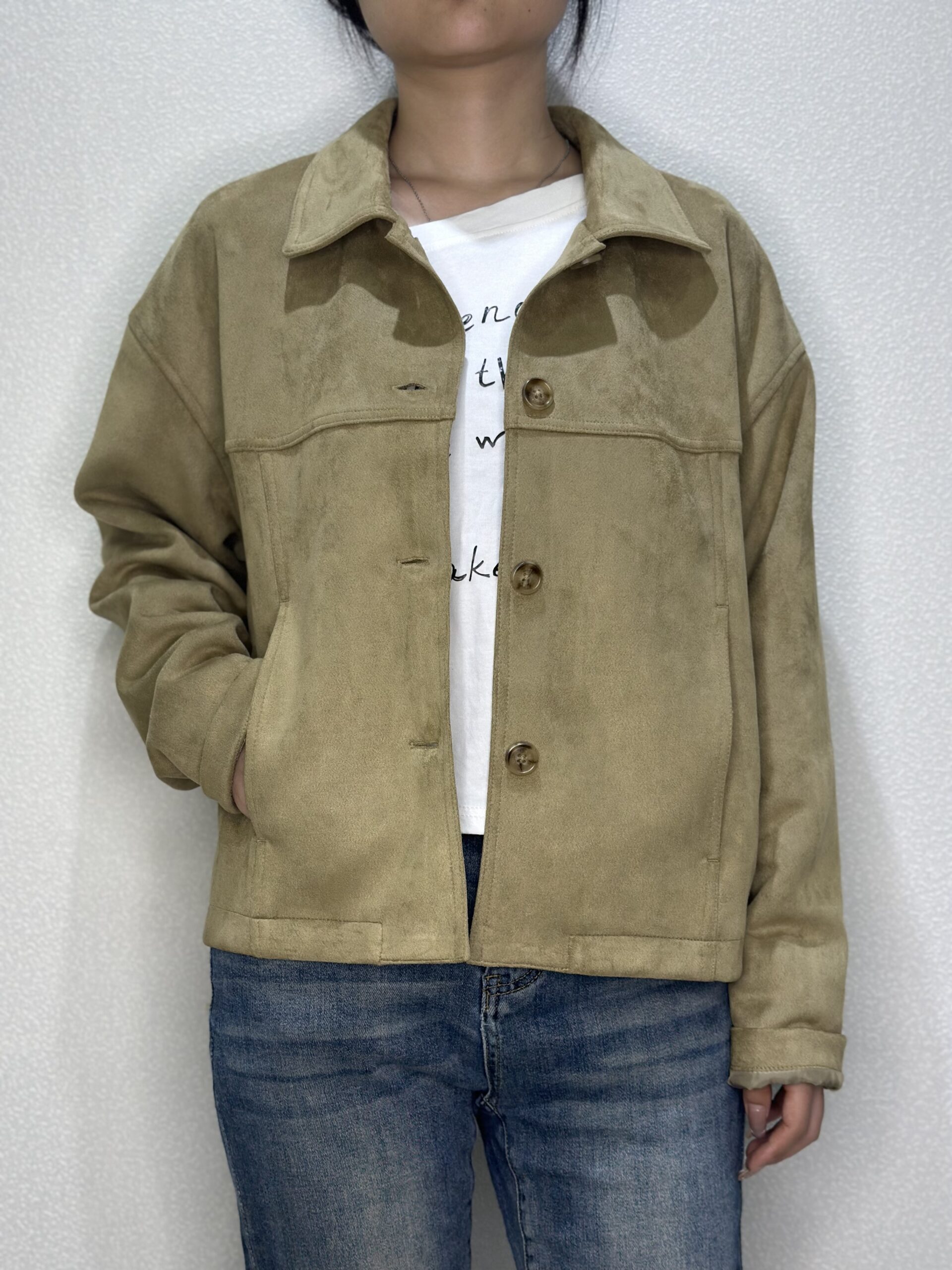 The fabric of the garment is suede, with a lapel style that looks very retro.