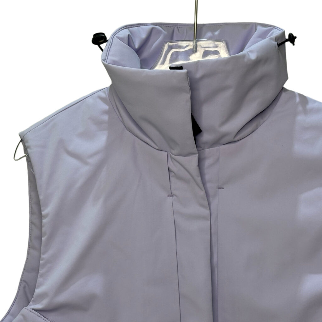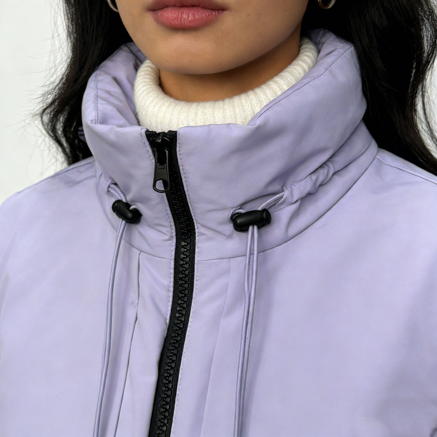 1. Collar Detail: Stand-up collar with adjustable drawcords (light purple cords + black cord locks) on both sides, allowing a