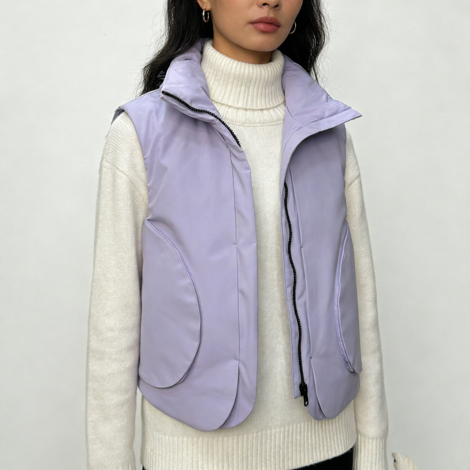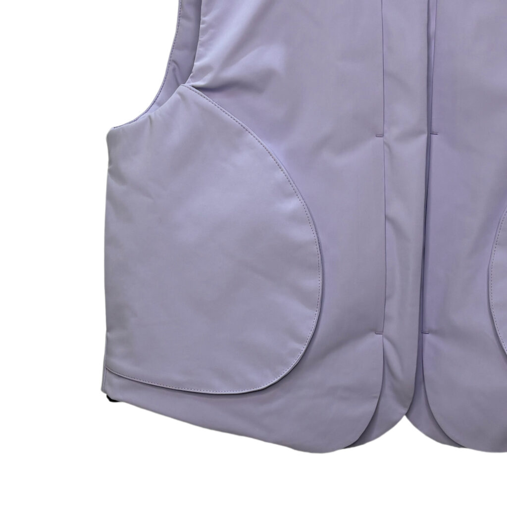3. Fabric & Stitching: Light purple matte fabric (smooth texture) with neat, precise stitching around the collar and zipper area.