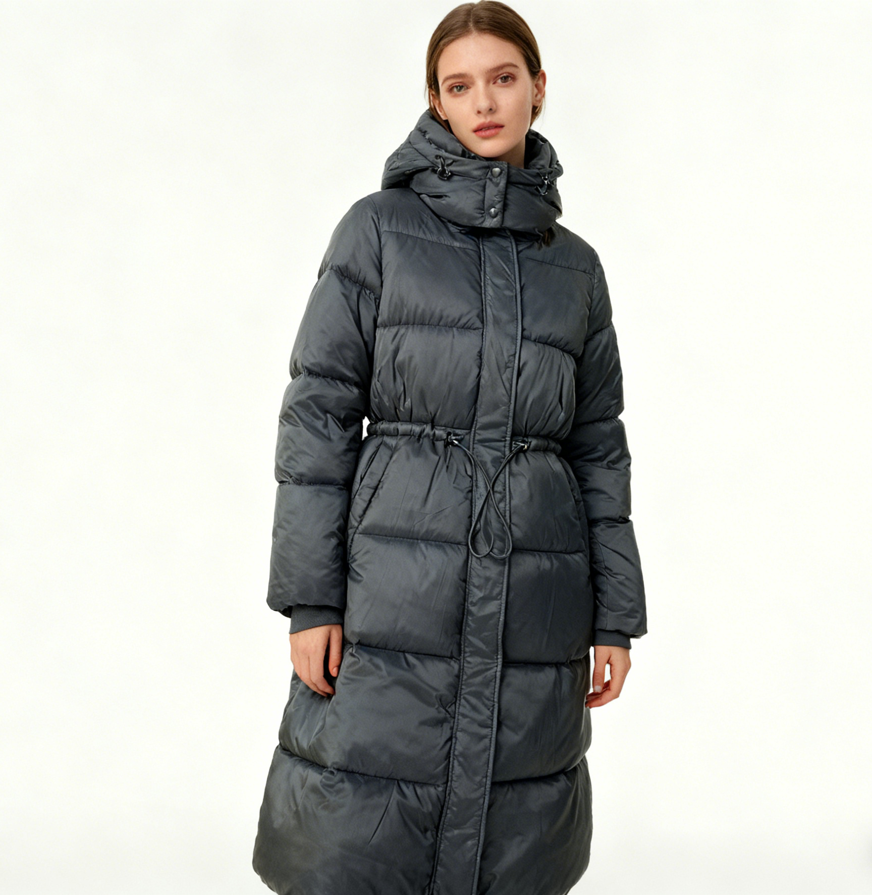 This long women’s down jacket boasts a practical and slimming style: