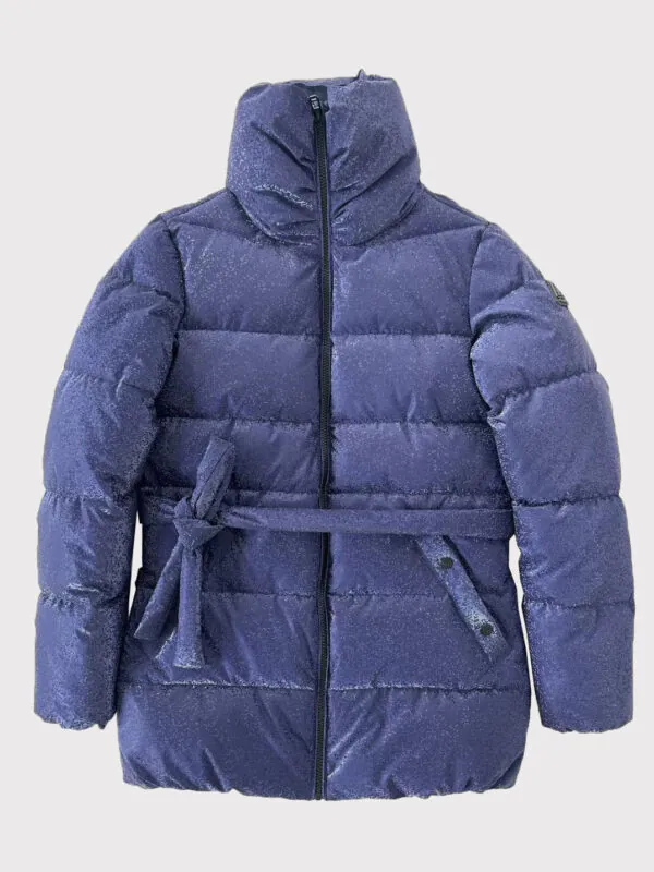 This garment is a dark navy puffer jacket with a stylish design. It is made of shiny material, which makes the overall appearance more attractive. The puffer jacket has a high collar design, which can well protect the neck from the cold wind. At the same time, it also comes with a belt that can be adjusted to shape the ideal body line.