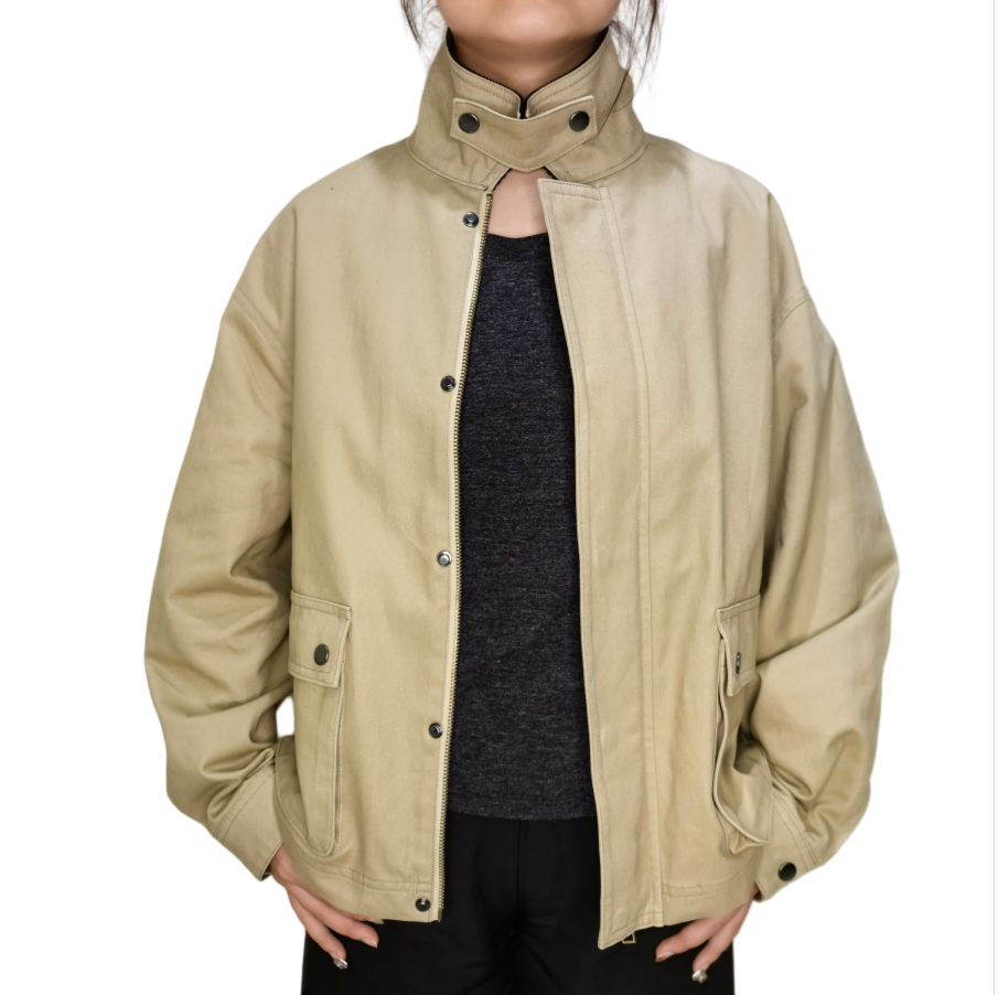 The collar can transform into a standing design for versatile styles, highlighting its vintage workwear charm with patch pockets.
